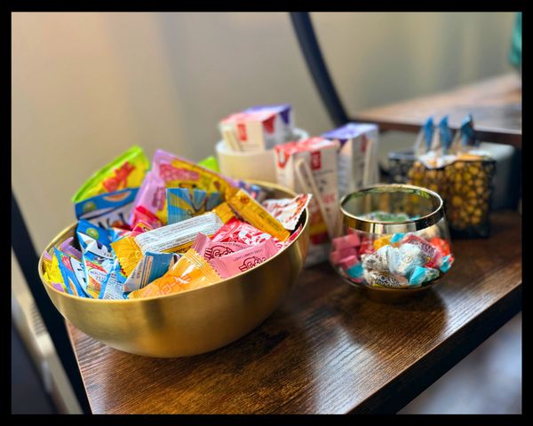 And yes—we know care starts with comfort. That’s why we have coffee, Bubly, soda, cold water, and keep our snack station stocked with a rotating supply of sour candies and little treats. Whether you need a grounding sip, a sugar boost, or just a quiet moment to gather yourself, it’s here for you.